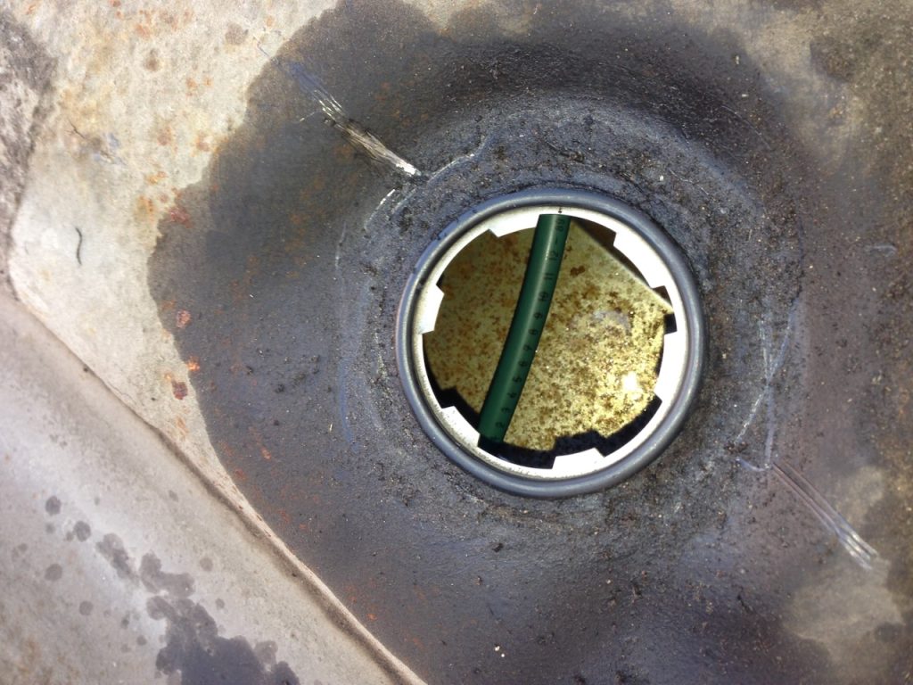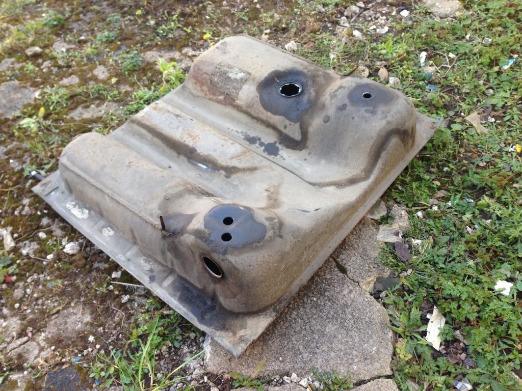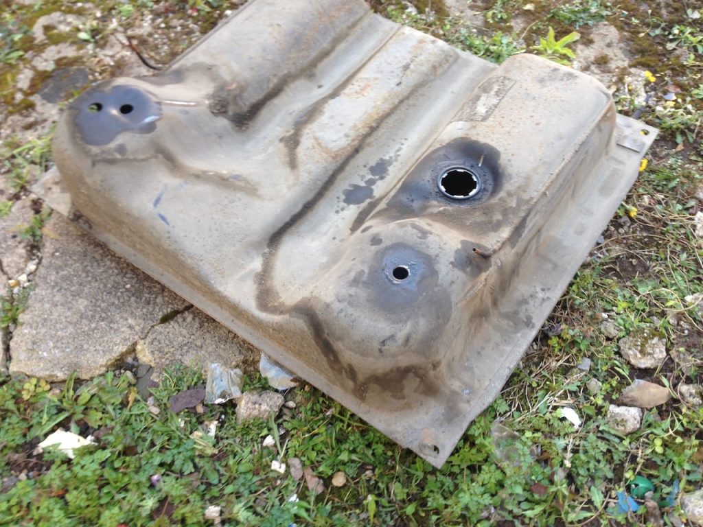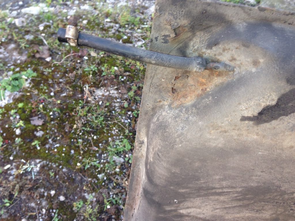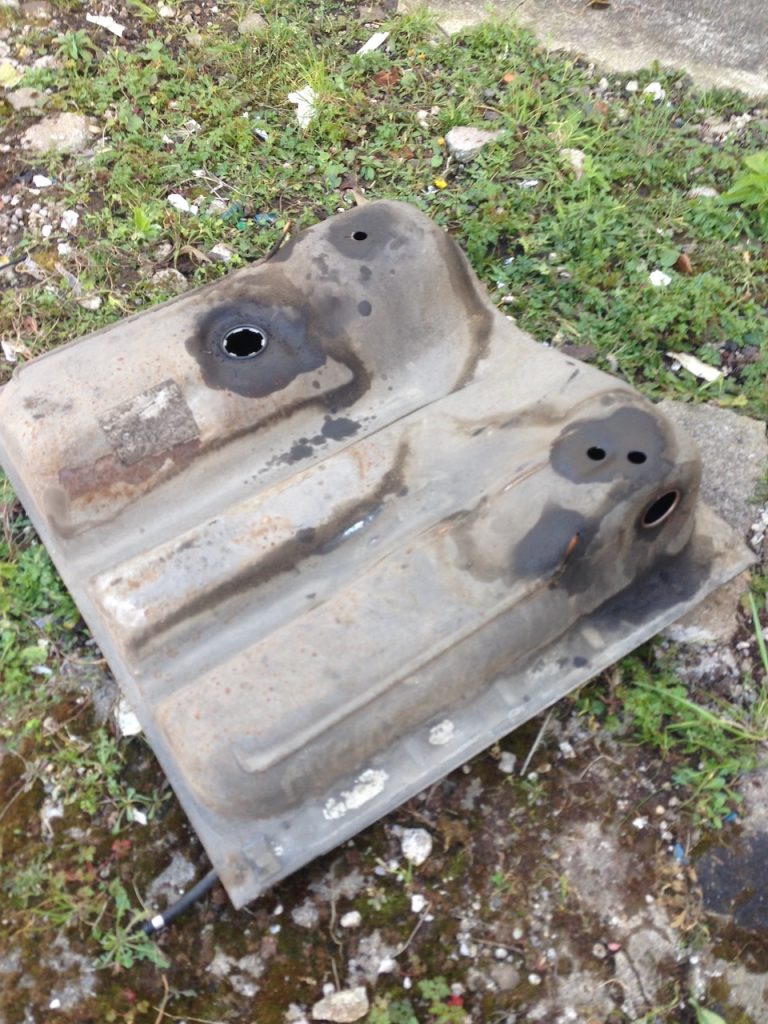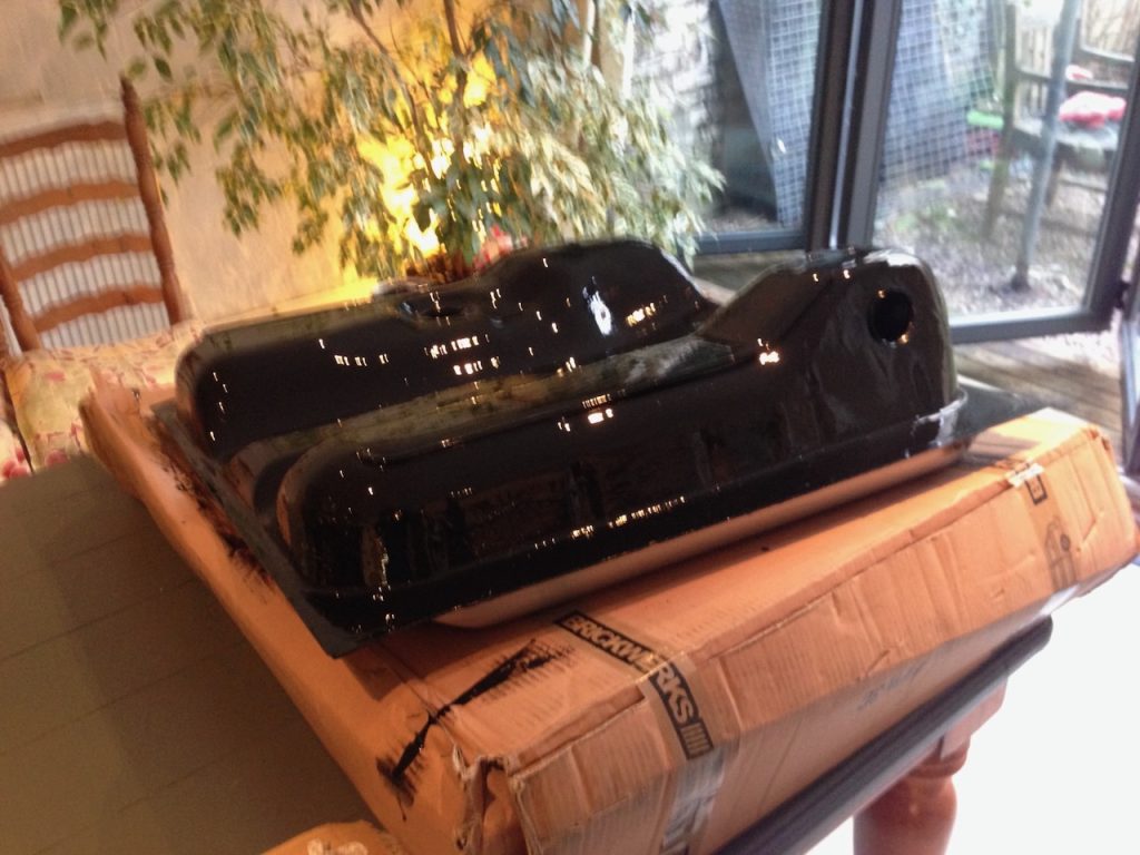 The new tank gets a full coat of hammerite gloss black and in it goes – as the tank tips down from its front edge you need to get the van up high on blocks (or have a ramp or lift) to get it out.